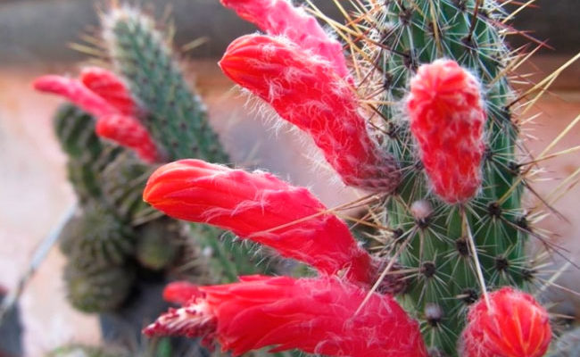 - Клейстокактус туписийский (Cleistocactus tupizensis). Стебли у этого растения вертикальные, прямостоячие, высотой около 1 м. Отличительная черта – красно-рыжие колючки, густо обрамляющие побеги. Цветки также имеют яркий красный оттенок.