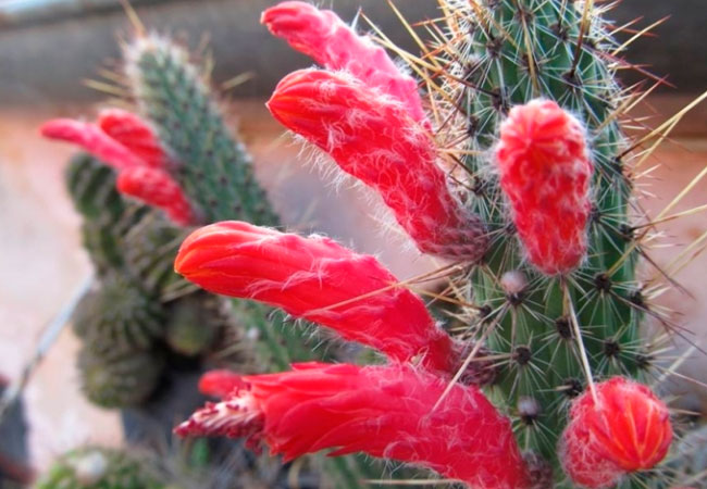 - Клейстокактус туписийский (Cleistocactus tupizensis). Стебли у этого растения вертикальные, прямостоячие, высотой около 1 м. Отличительная черта – красно-рыжие колючки, густо обрамляющие побеги. Цветки также имеют яркий красный оттенок.