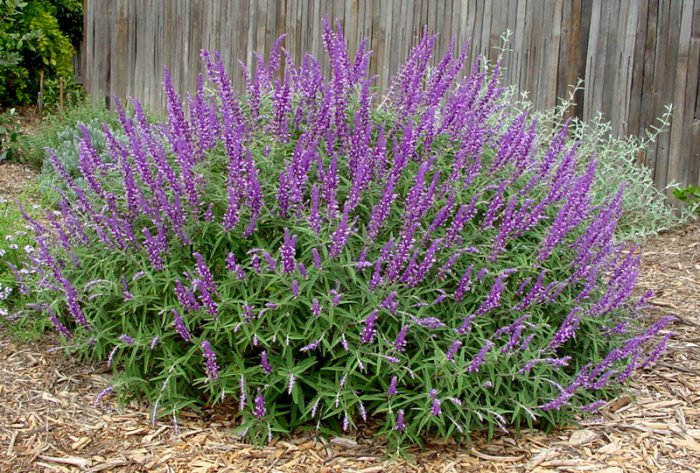 Сверкающая сальвия фиолетовая является очень эффектным растением. Дело в том, что насыщенно-фиолетовый окрас многократно усиливается густым опушением.