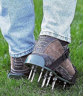 - Сандалии-аэраторы. На подошве таких сандалий прикреплены острые шипы. Все, что вам нужно сделать — пройтись по газону в такой обуви.